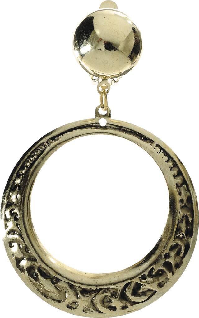 This metal, gold-finish earring features an eccentric hoop design with antiqued "hammered" detail