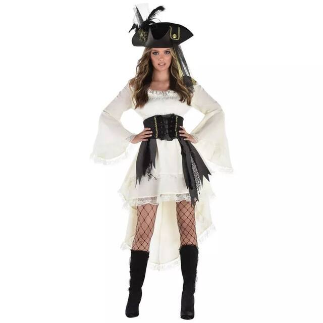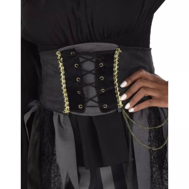 Complete your Halloween look with the Pirate Wench Waist Corset Cincher. This eye-catching corset features intricate black lace with a gold trim, adding a touch of authenticity to your pirate costume. The antique gold chains provide a unique and stylish finish, making the corset a perfect choice for any pirate-themed outfit.