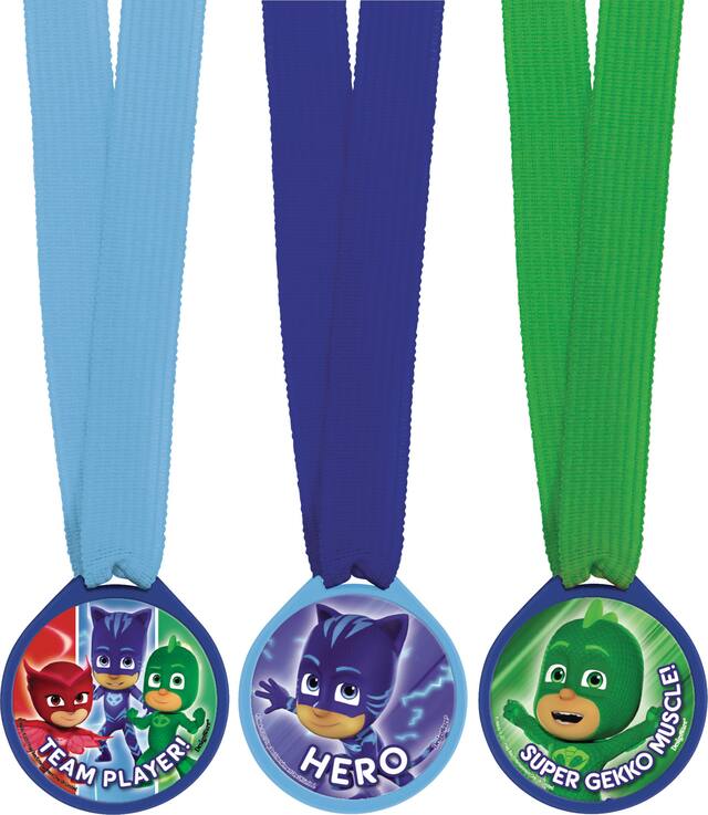 You may be interested in these similar products shown below.PJ Masks Award Medals feature blue, green, light blue, and red cloth necklaces with round plastic medallions