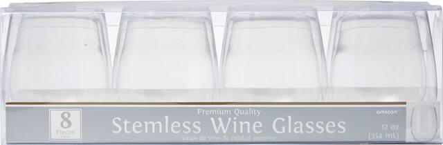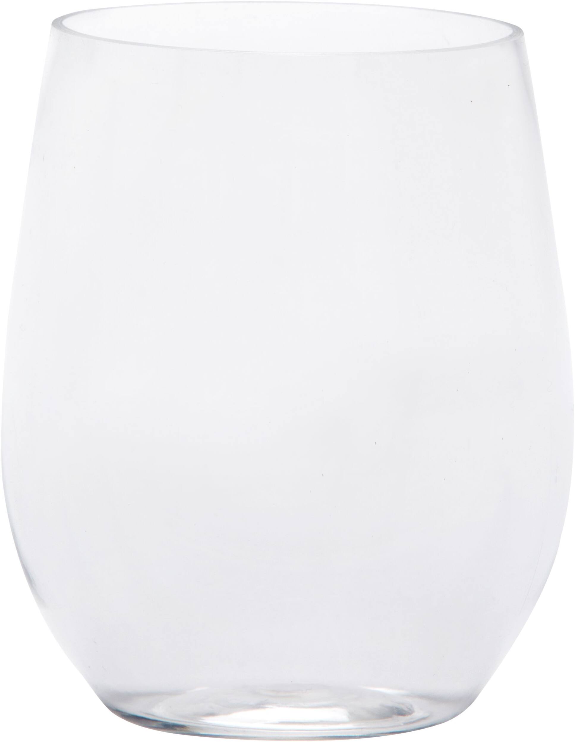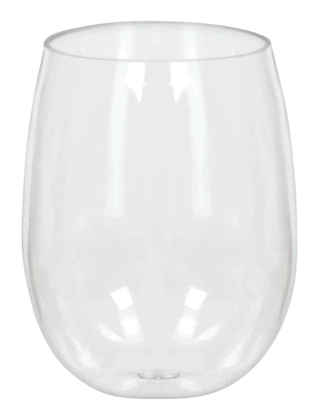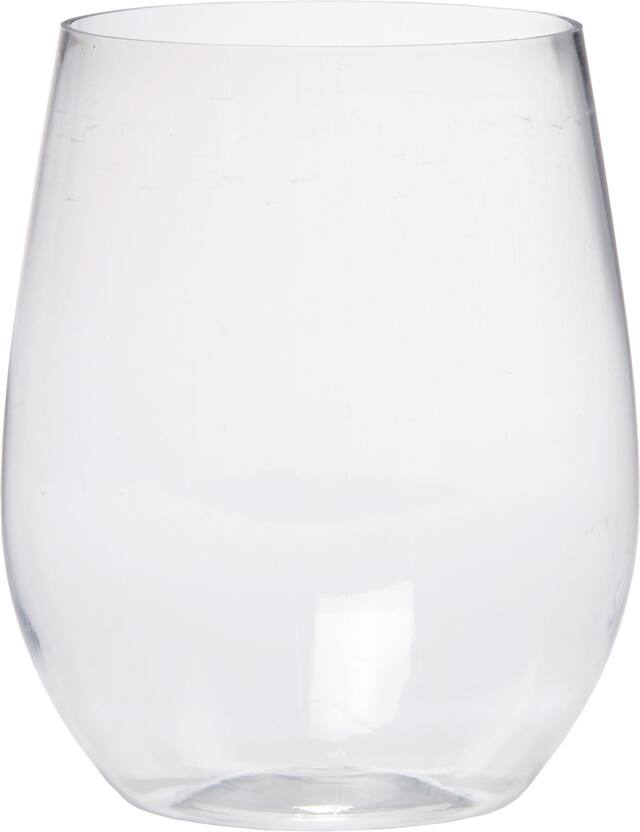 Stemless wine glasses are made of durable plastic and have a simple design to match any theme