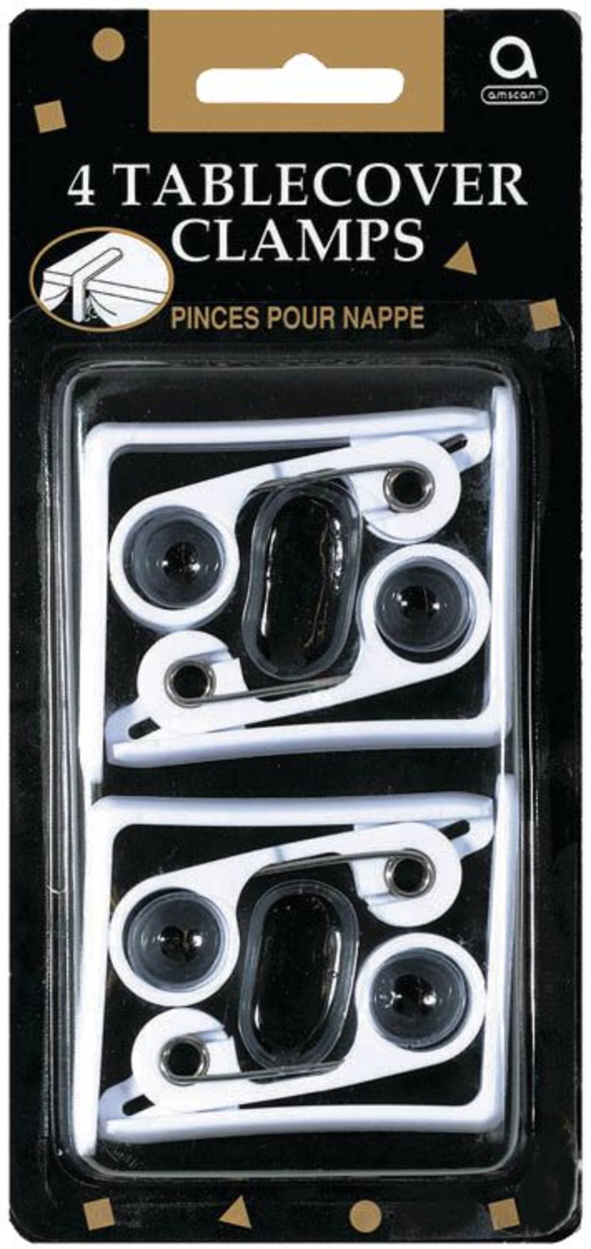 Spring-loaded table cover clamps anchor plastic, fabric, and paper table drapes, latching onto tabletops of any thickness up to an inch and a half