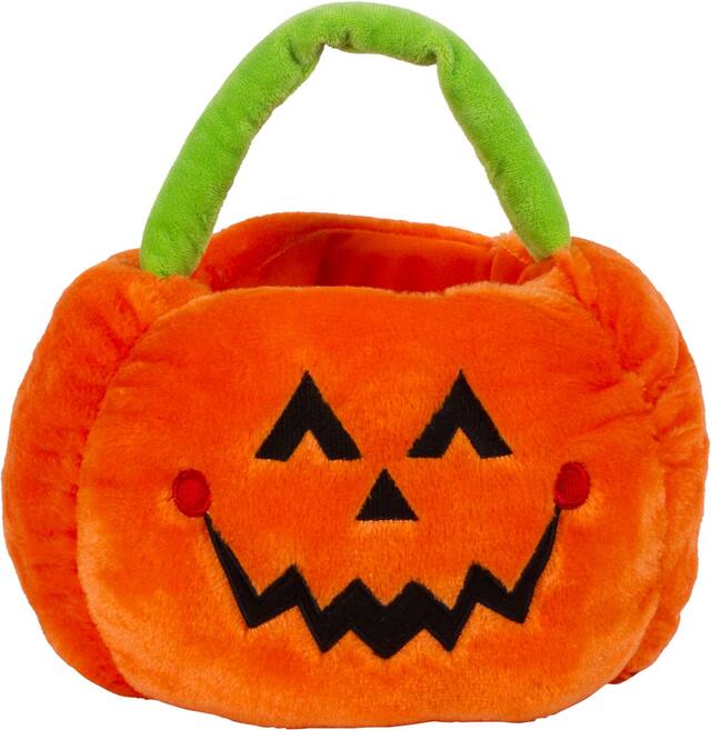 Features a plastic bucket covered in orange plush material that's embroidered with a black jack-o'-lantern face