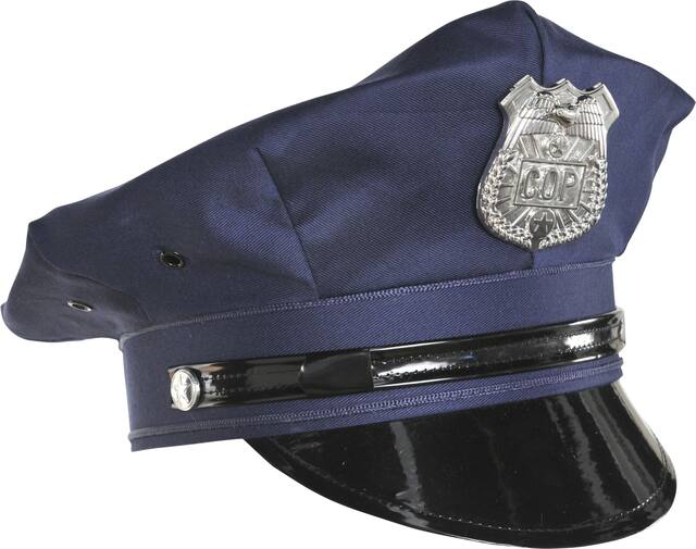Navy blue cop hat has a black vinyl visor and comes with a highly-detailed plastic badge attached on the front