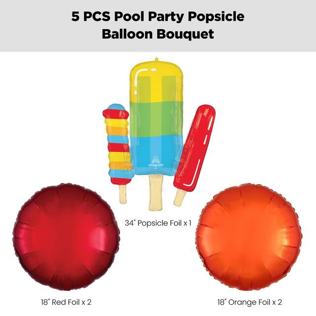 This kit includes: 1 Pool Party Popsicle 34" Supershape Balloon (SKU 8551537), 2 18" Orange Round Foil Balloons (SKU 8432003) and 2 18" Red Round Foil Balloons (SKU 8423907)