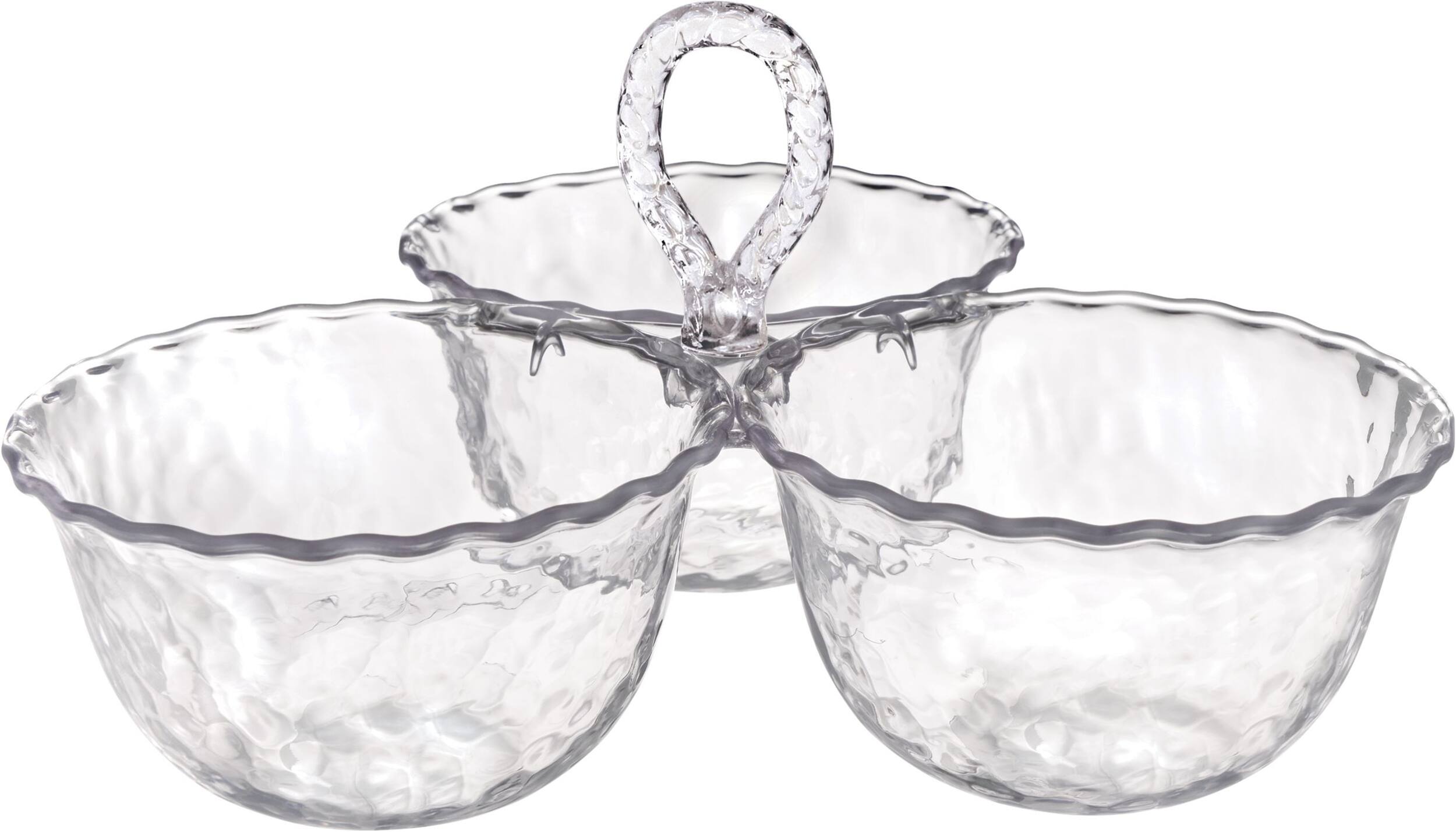 • Premium Plastic Hammered 3-Part Serving Bowl is made of clear plastic and features three connected bowls and a handle for easy transport