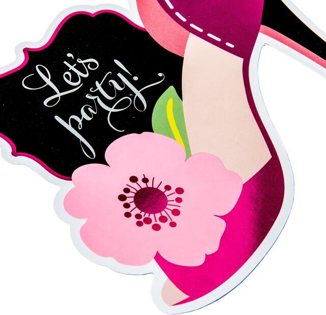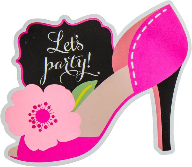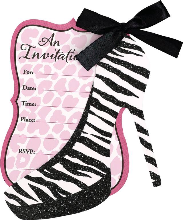 • Premium Glitter Zebra Shoe Invitations feature a glitter cut-out of a zebra-print, high-heeled shoe with a black ribbon bow at the top