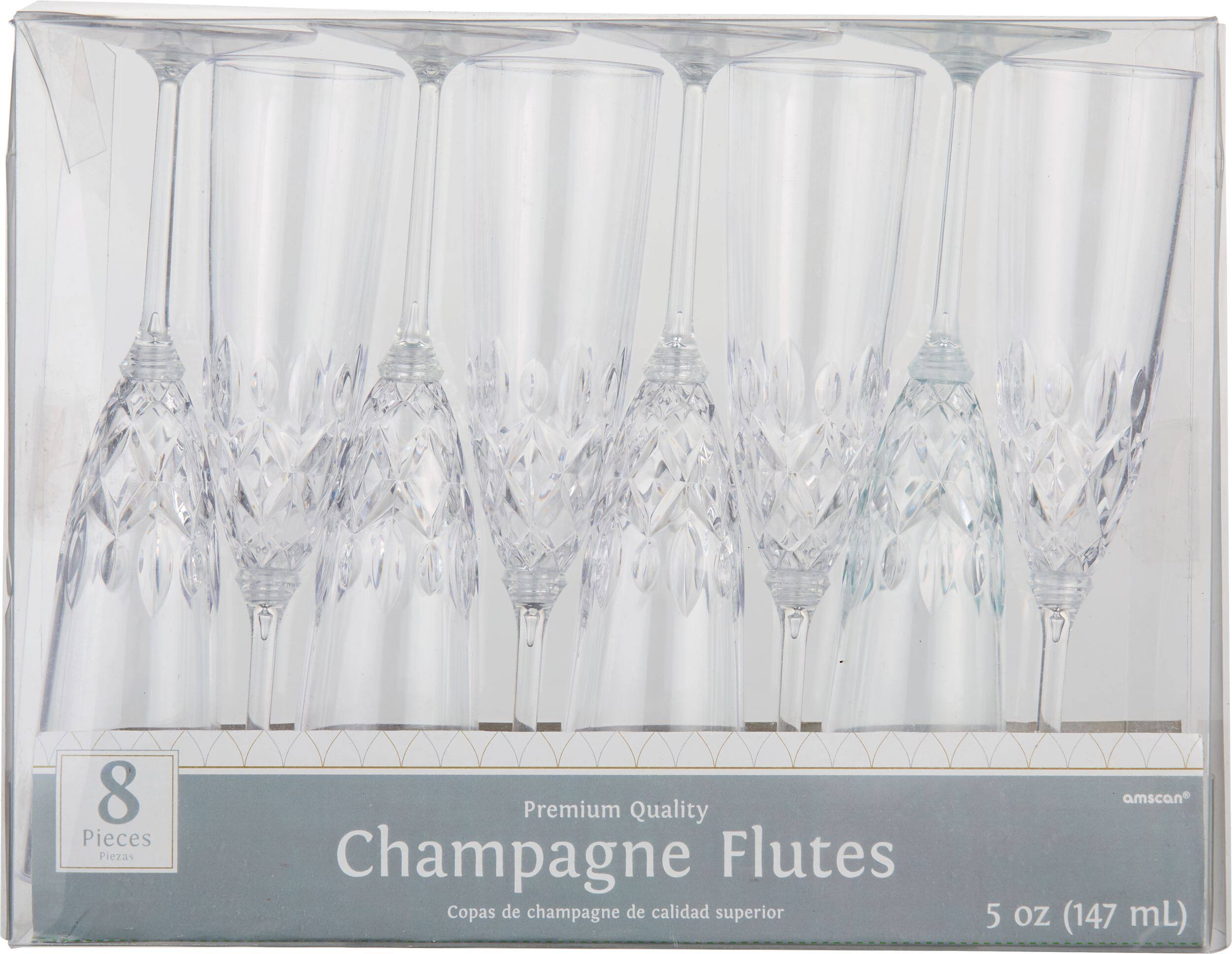 Features plastic glasses that resemble crystal champagne flutes
