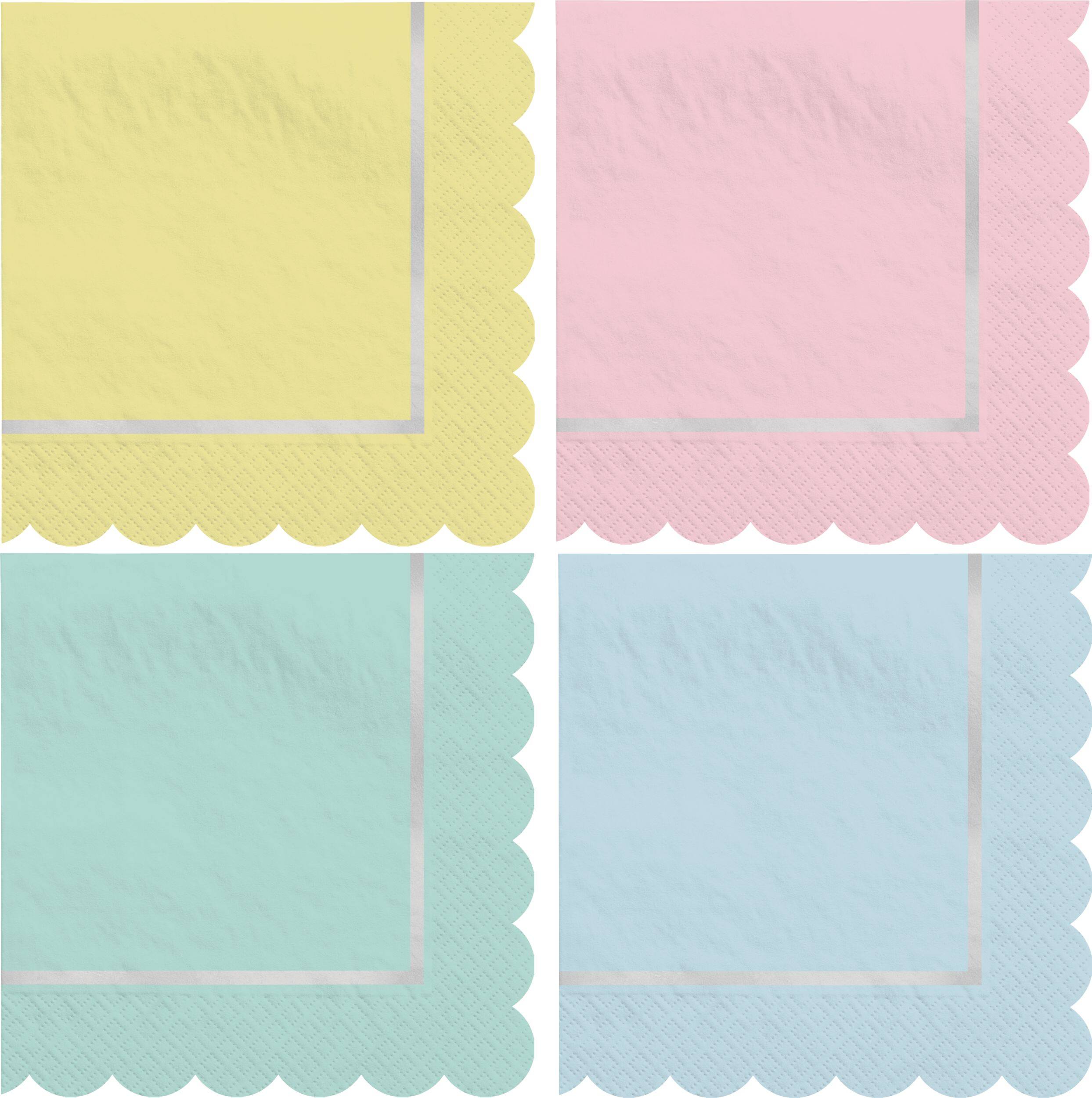Two-ply small paper napkins feature a decorative metallic silver border and scalloped edges and include four assorted colours: mint green pastel blue pink and yellow
