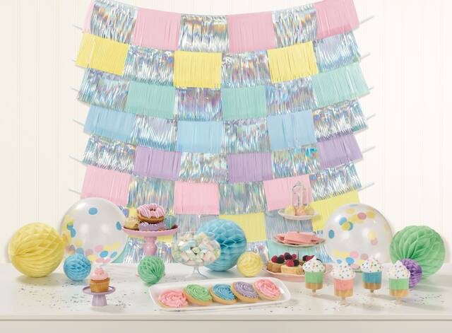 Mint green, pastel blue, pink, purple, yellow and iridescent banners feature strands of plastic fringe