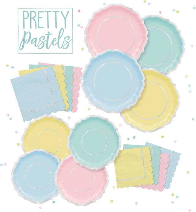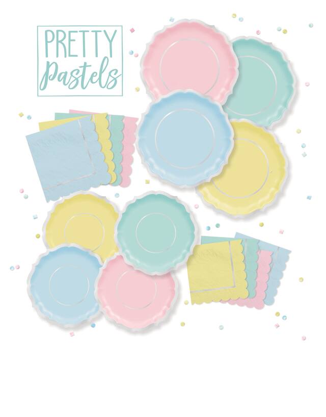 Set includes two plates each in mint green pastel blue pink and yellow