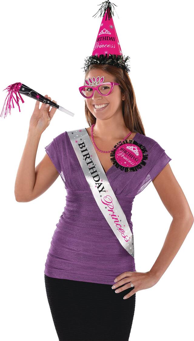 Shiny silver and pink accessories printed with "Birthday Princess" will add a touch of birthday flair to any outfit
