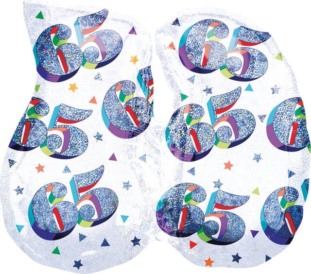 Large shape foil balloon features a dazzling 65 Happy Birthday message