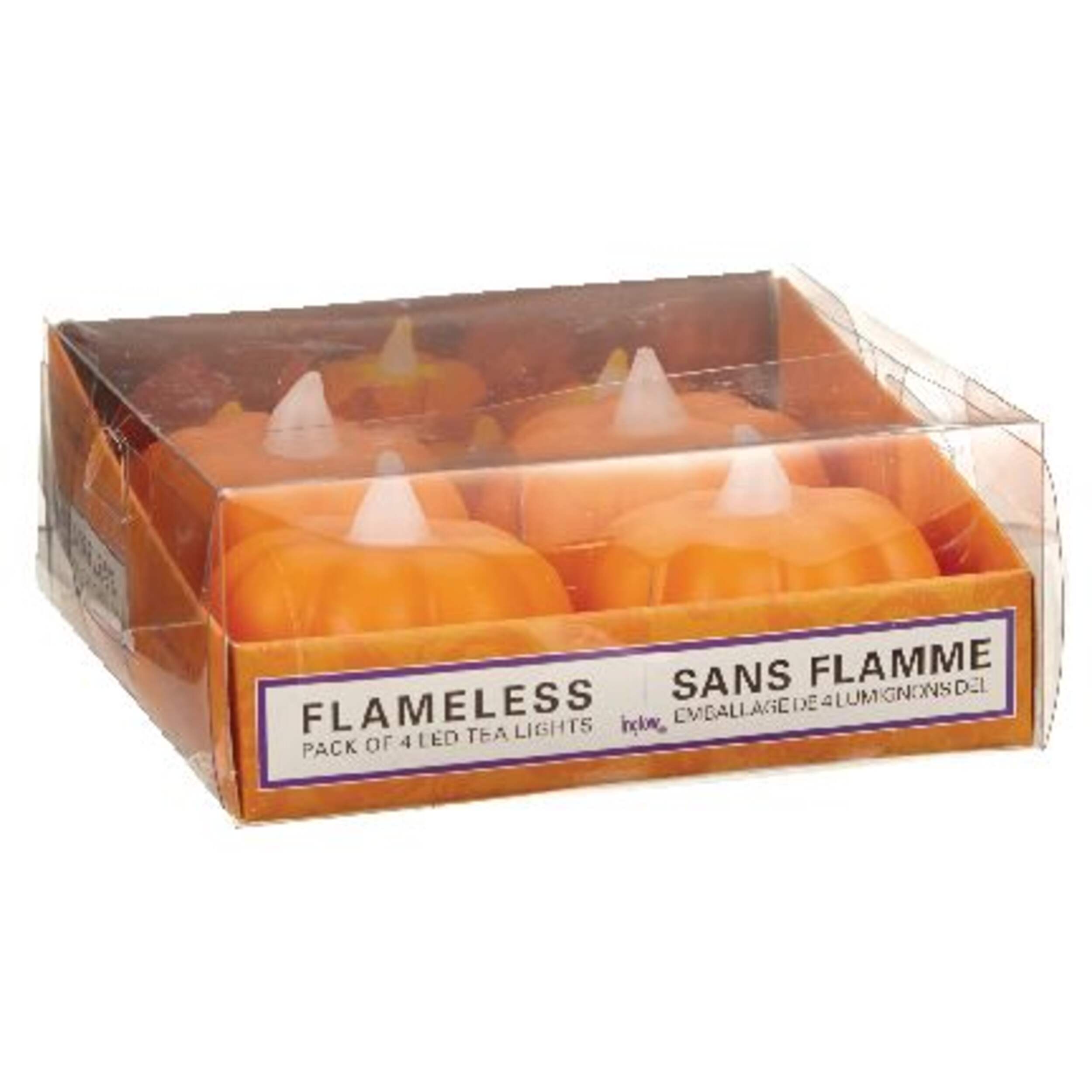 Light up your Halloween décor this year with these cute For Living LED Pumpkin Candles. This flameless candle kit includes four candles adorably shaped like pumpkins. The patented and realistic wick gives off a gentle flameless light so they are safe around children and pets. These orange flameless candles come in a set of four and fit most candle holders. Great for accenting your fall décor, these pumpkin candles measure 3" each.