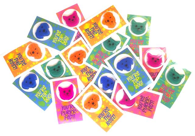 You may be interested in these similar products shown below.Puppy Kitty Valentine Exchange Cards with Gel Cling Decals feature cute sayings such as "You're Top Dog!" on the front