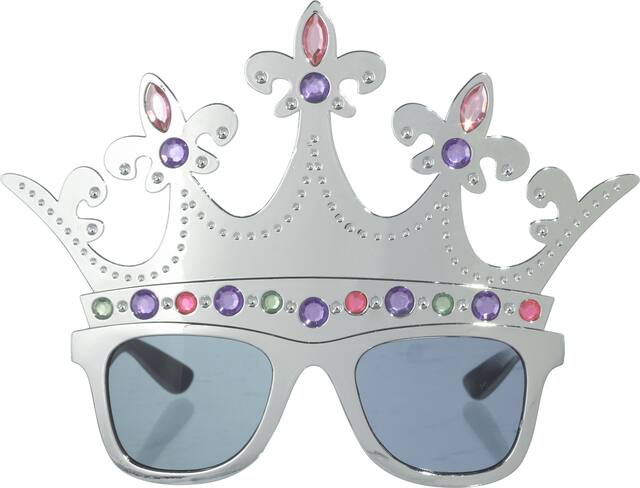 Silver sunglasses have an attached plastic crown on the front with faux gem accents