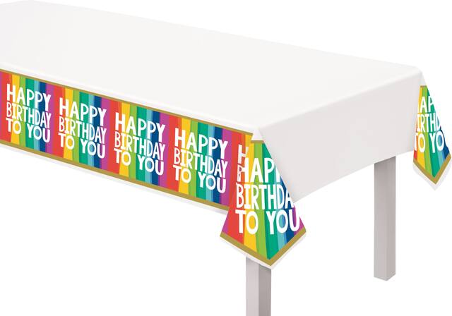 Borders feature the repeating headline "Happy Birthday To You" on a background of rainbow stripes while the centre is left blank to allow your place settings and centrepieces to really shine