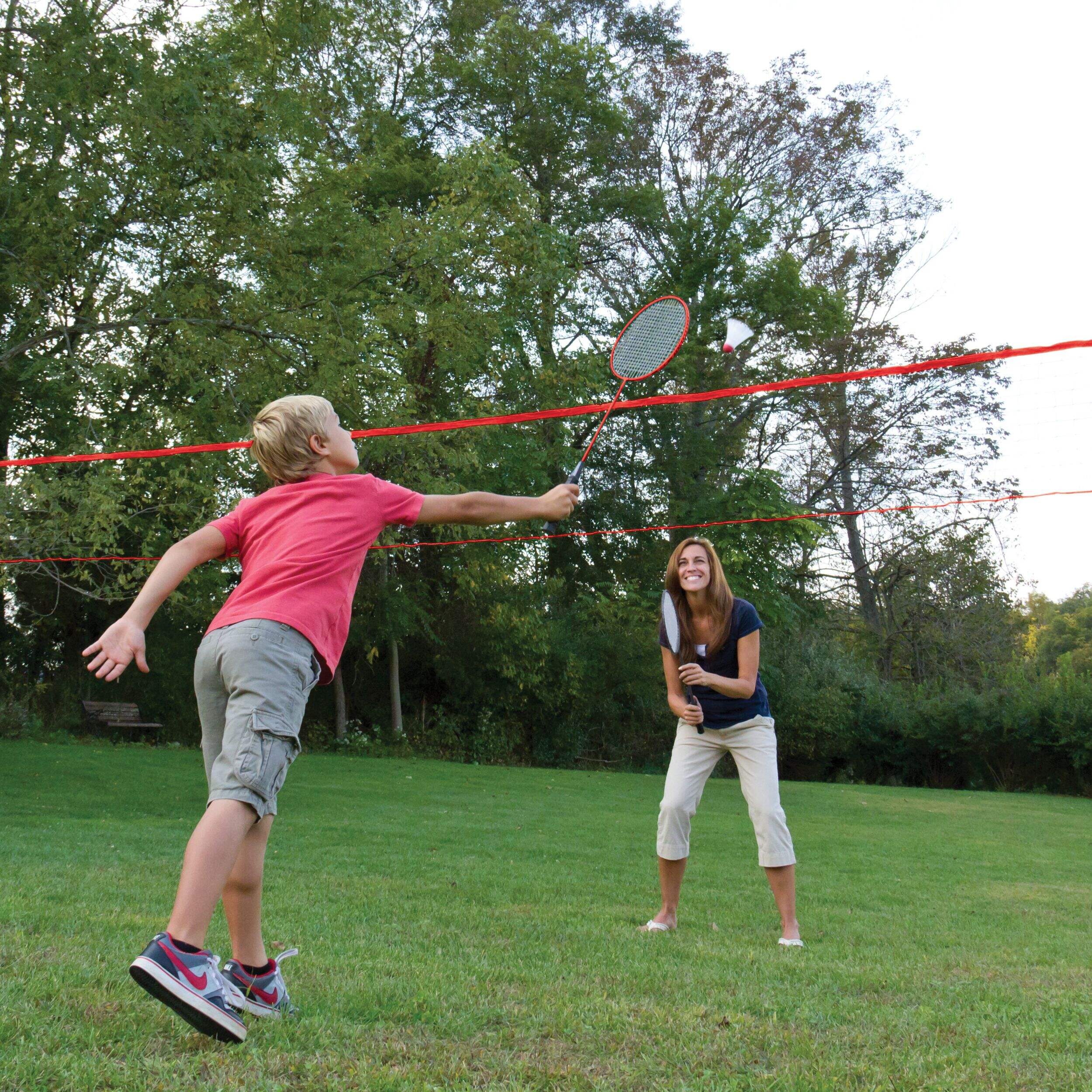 Includes: Fast setup net and pole system stands 5.5 ft x 20 ft, 1 official size vinyl volleyball with inflating pump and needle, 2 badminton rackets with tempered steel shafts, 2 Majik smash rackets, 2 shuttlecocks, 1 Majik smash ball, 2 scoopball launchers, 1 scoopball, 1 flying disc, 4 lawn darts with spring-out ring, 1 convenient carry bag with shoulder strap for transport and storage, and complete set of game rules