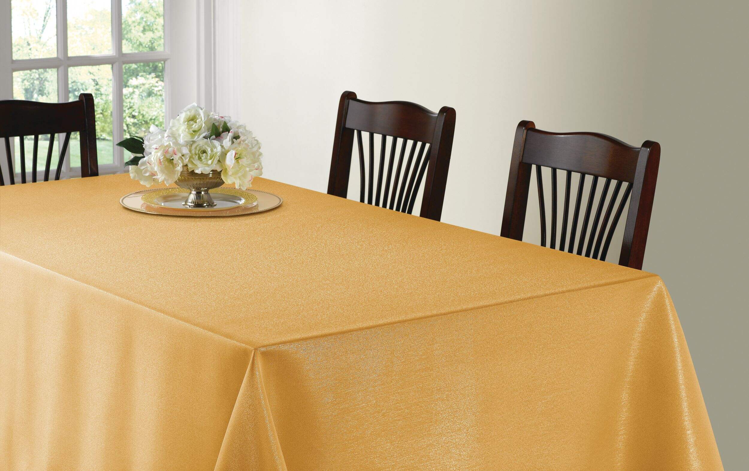 With a subtle shimmer and a finely woven texture, the reusable and washable fabric tablecloth is a great foundation for a holiday feast or a decorative display