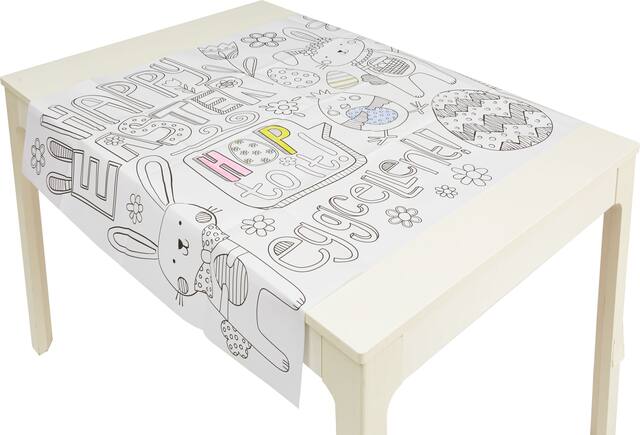 Paper table cover is white and features various Easter designs to colour in, including bunnies, chicks, Easter eggs, and more