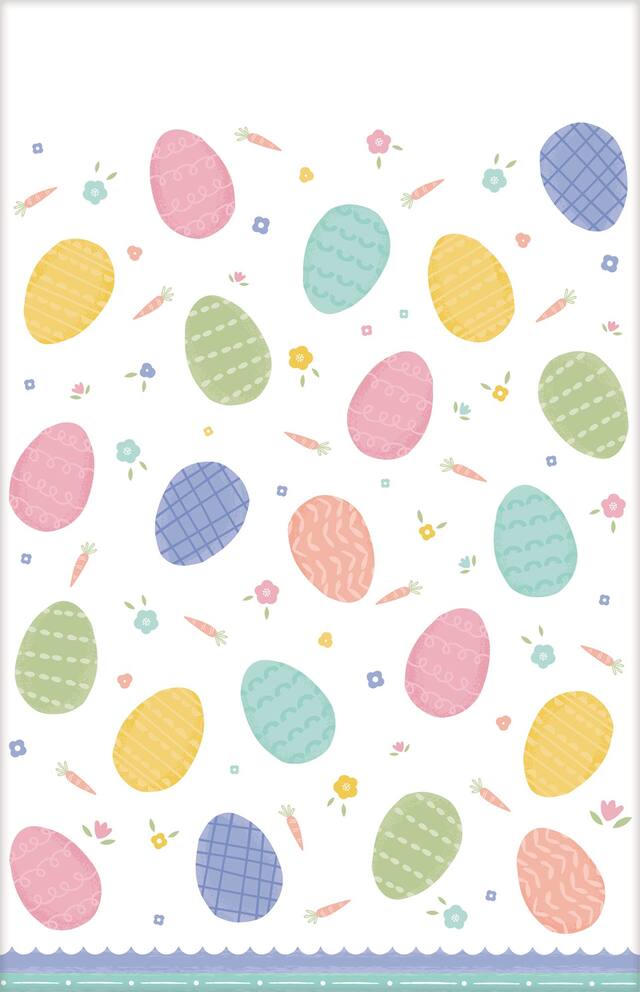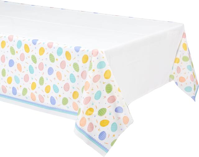 You may be interested in these similar products shown below.Pretty Pastel Easter Table Cover is a plastic cover that has a white centre to show off your table settings and features frolicking flowers, carrots, and Easter eggs
