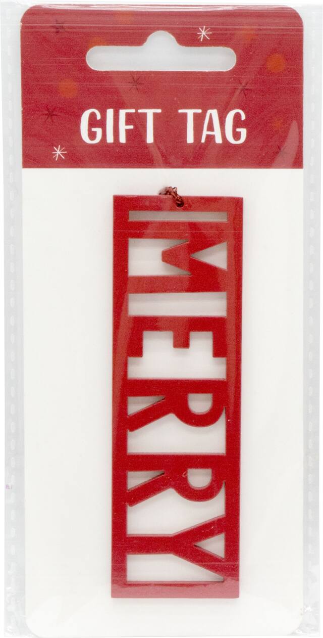 Wooden gift tag features the headline "Merry" carved in block letters with a festive red finish