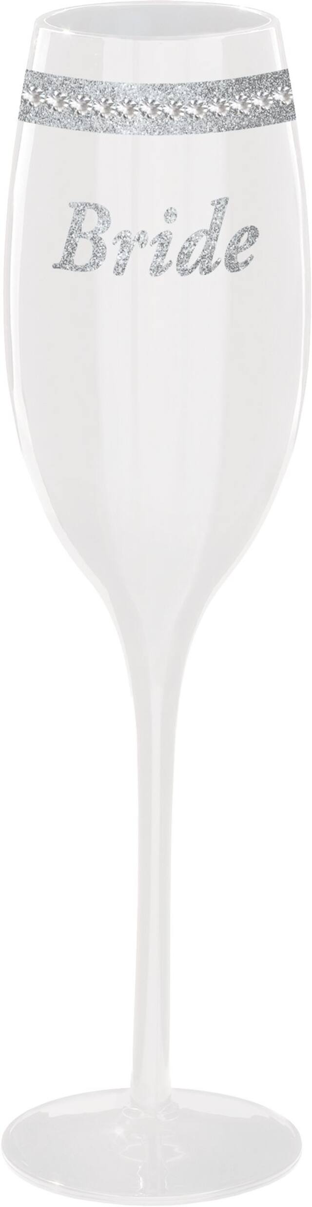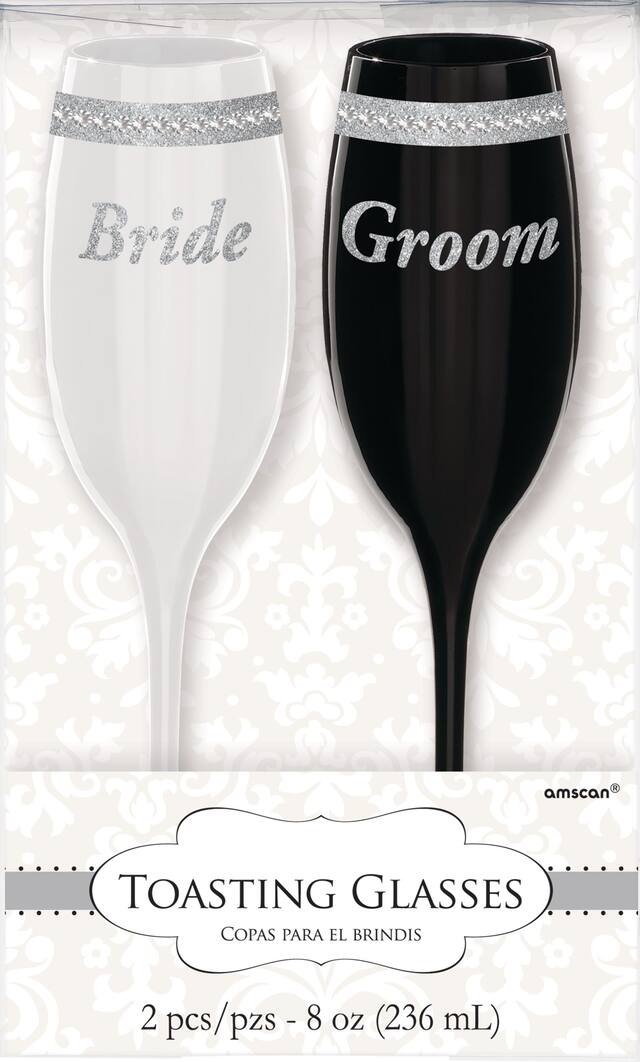 Black and white champagne flutes feature "Bride" and "Groom" in glitter script with rhinestone accents