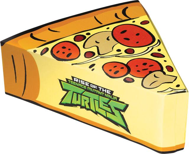 Cardstock boxes are designed to look like slices of pizza and feature the Rise of the Teenage Mutant Ninja Turtles logo on the side