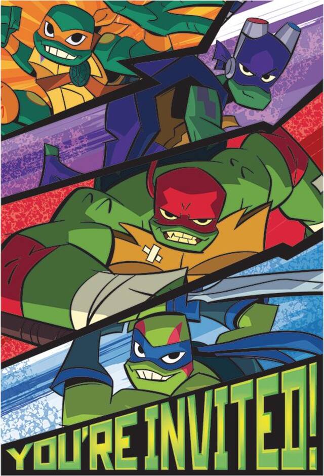 Postcard-style invitations feature the four Ninja Turtles above a "You're Invited!" headline