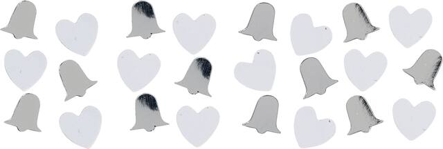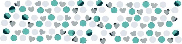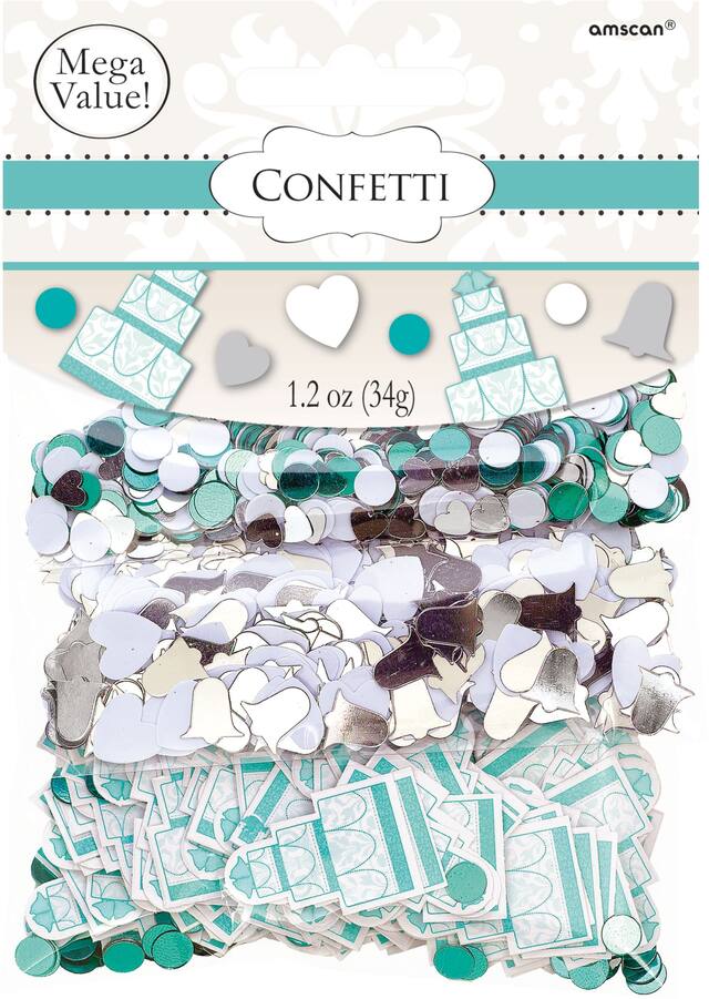 Features a three-pack of lovely confetti mixtures, including three-tier wedding cake cardstock cut-outs with foil blue dots, foil silver bells with white hearts, and tiny blue, white, and silver dots and hearts