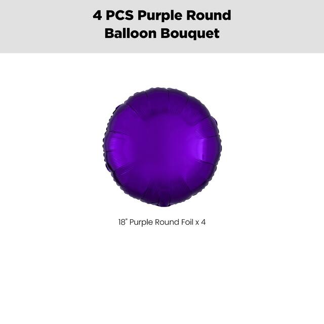 Create an instant festive atmosphere with this Round Foil Balloon Bouquet in purple. Featuring a cluster of 18” round foil balloons, this 4-piece bouquet spreads joy at parties, anniversaries and milestone events.