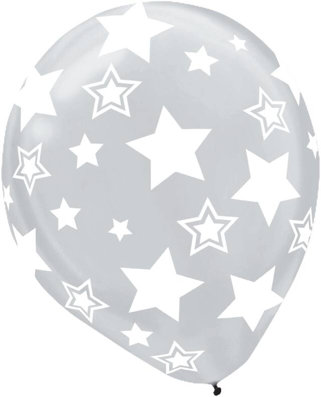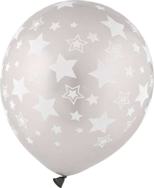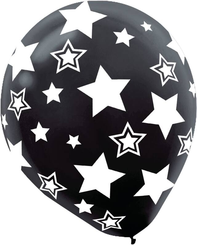 Metallic Star Balloons features all-over white stars over black, pearlized silver, and gold