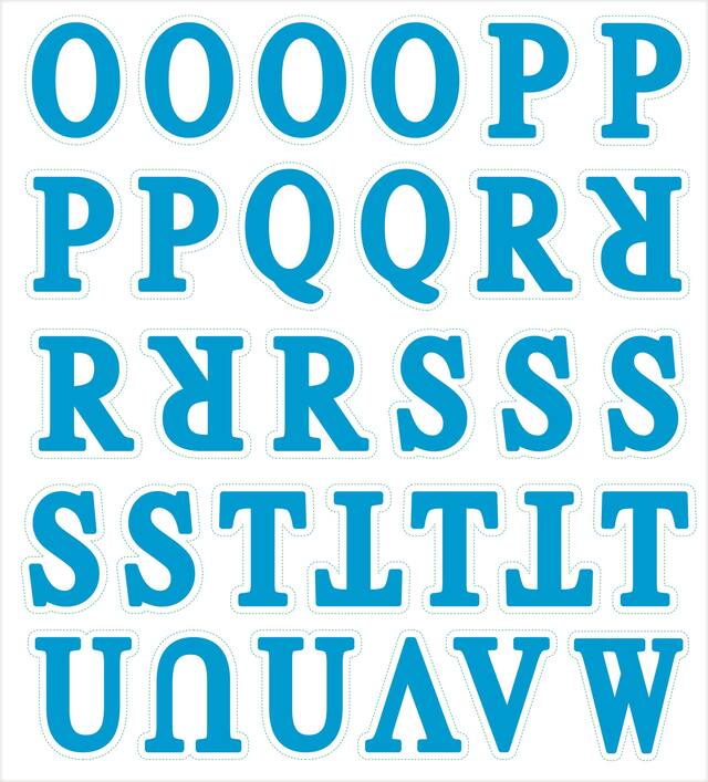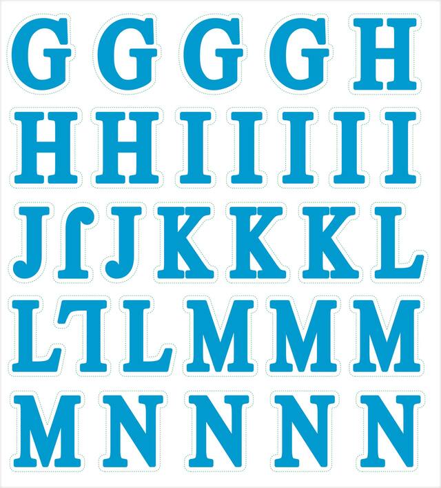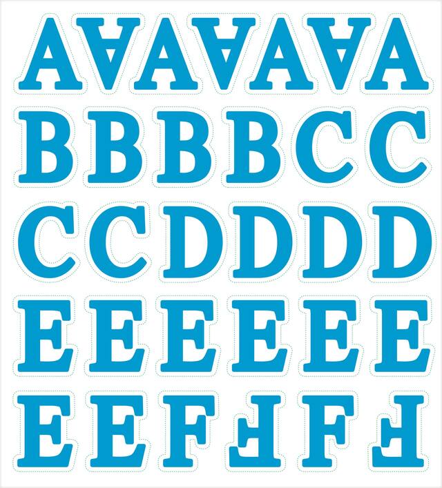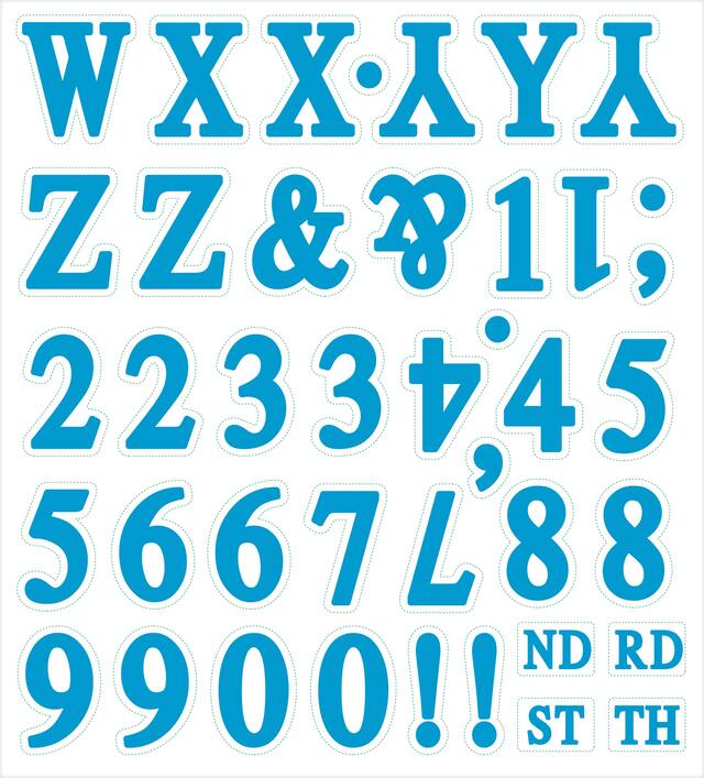 Includes 120 numbers and characters stickers: (8) E, (7) A, (5) each of : I, R, S, T, (4) each of: B, C, D, F, G, L, M, N, O, P, (3) each of: H, J, K, U, Y, (2) each of: Q, V, W, X, Z, !, &, 0-9 ,period, and (1) each of: ST, RD, TH, ND and apostrophe