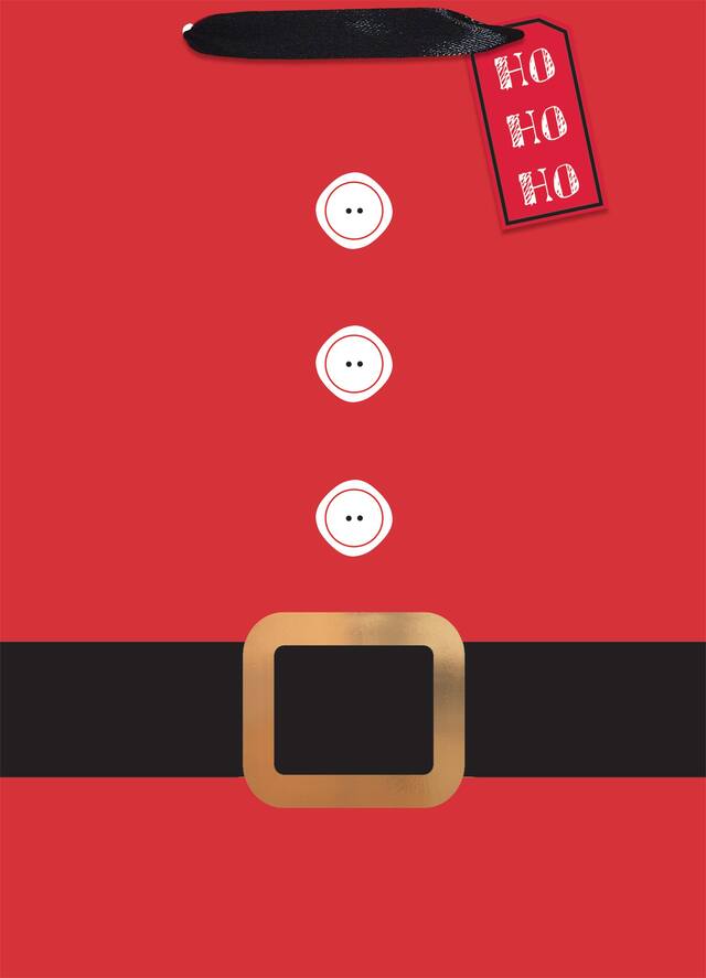 Black ribbon handles have a gift tag attached that has a Ho Ho Ho headline printed on it
