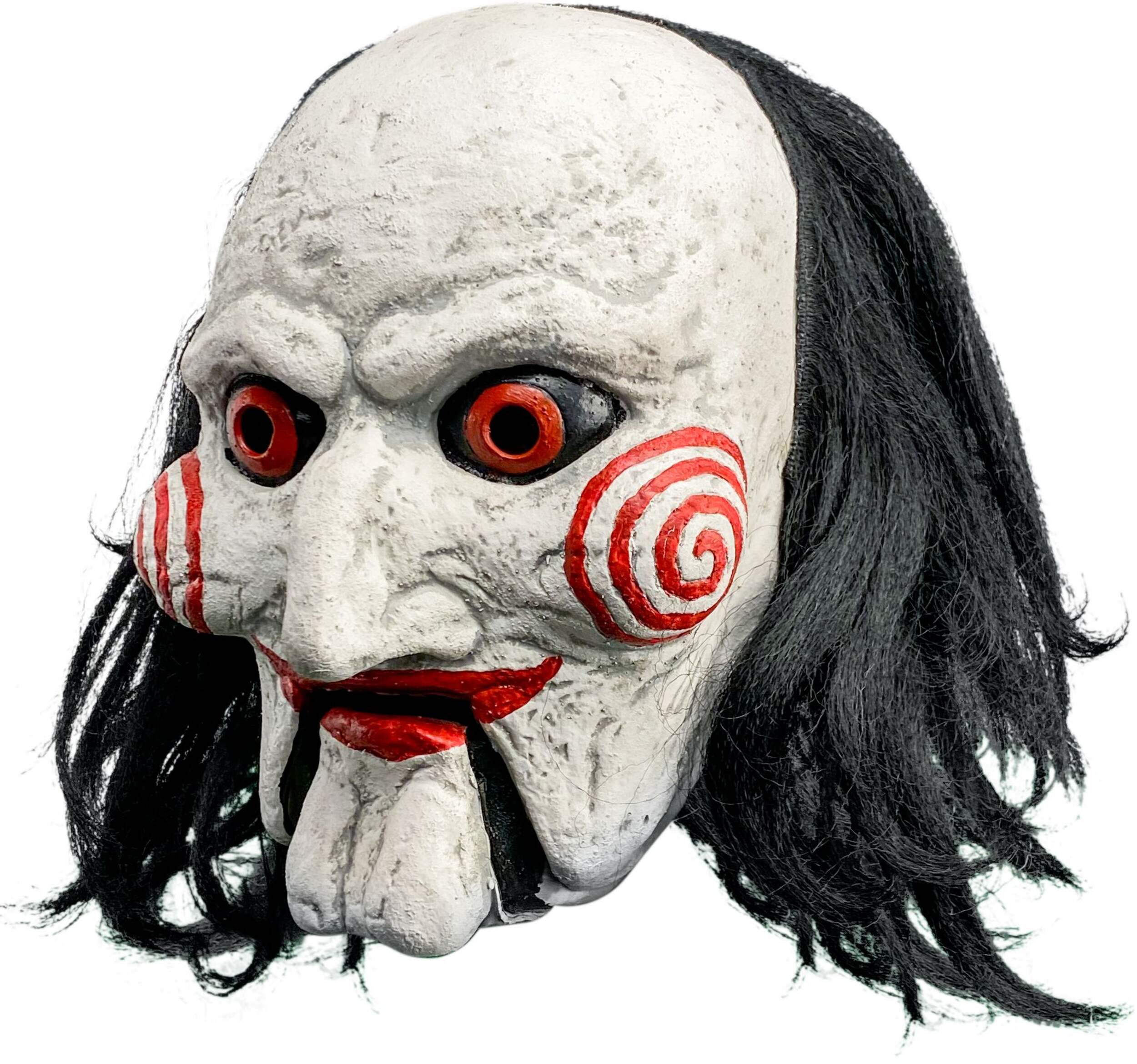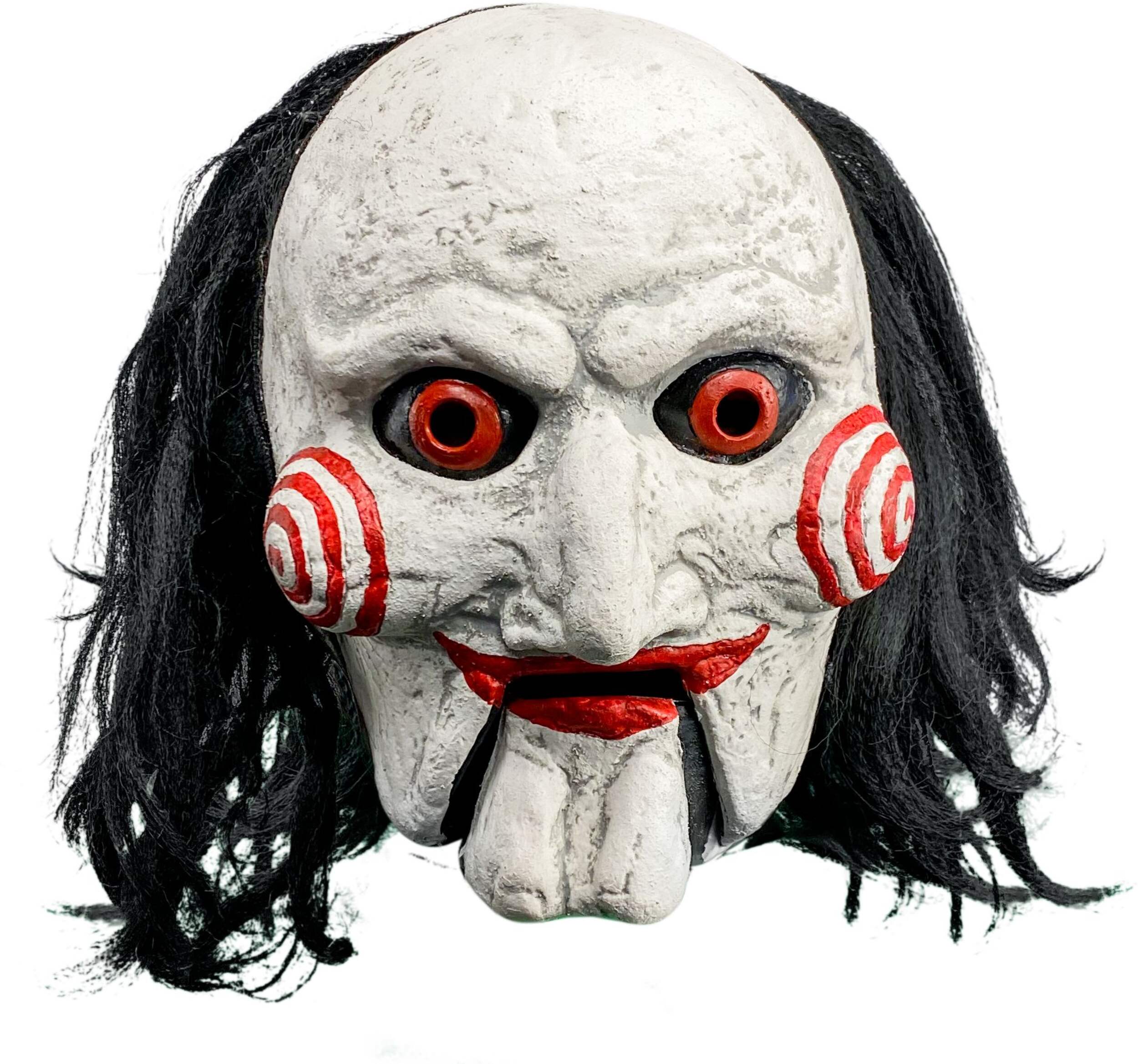 Transform into the iconic Billy the Puppet from the SAW horror movie series with this officially licensed Billy the Puppet mask. Featuring a moving mouth, this Halloween mask adds an extra layer of horror to your Halloween costume. Perfect for fans of the SAW franchise, this horror mask ensures a spine-chilling look that will leave a lasting impression.