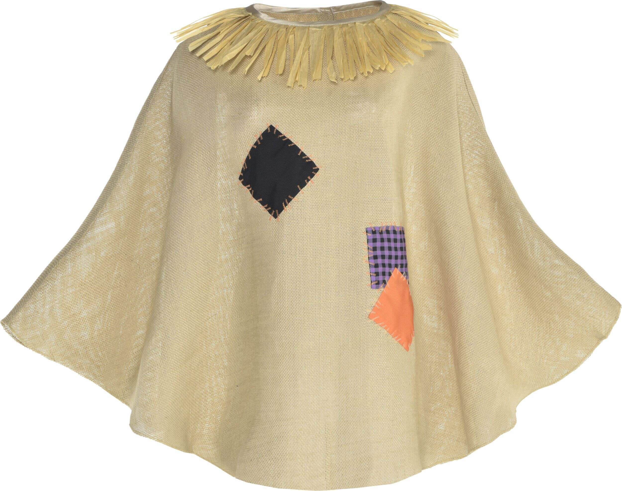 Brown jute poncho with colourful patch designs and a straw neckline looks great with the rest of your scarecrow costume