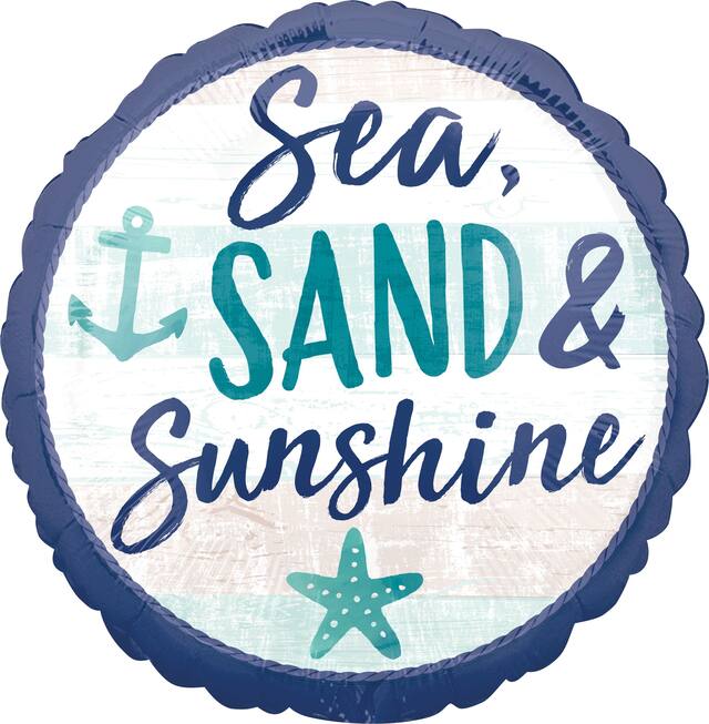 Round foil balloon features a blue Sea Sand & Sunshine headline with an anchor and a starfish
