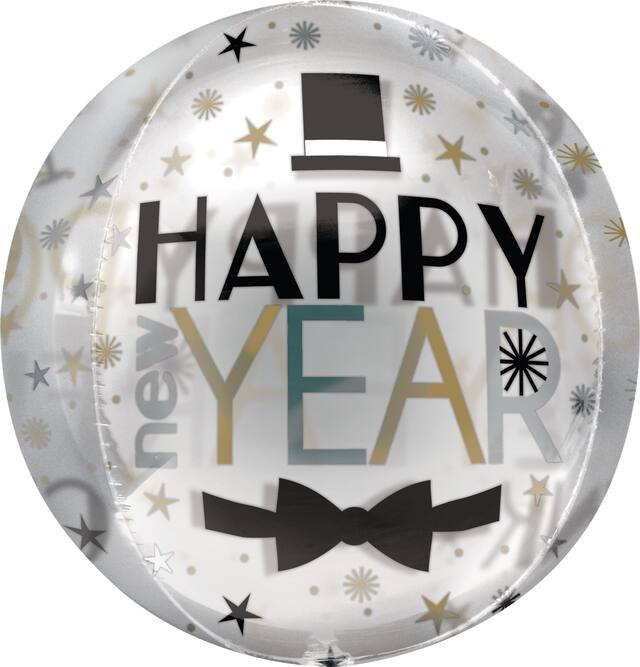 The ball-shaped see-through foil balloon features a Happy New Year headline with a top hat and a bow tie