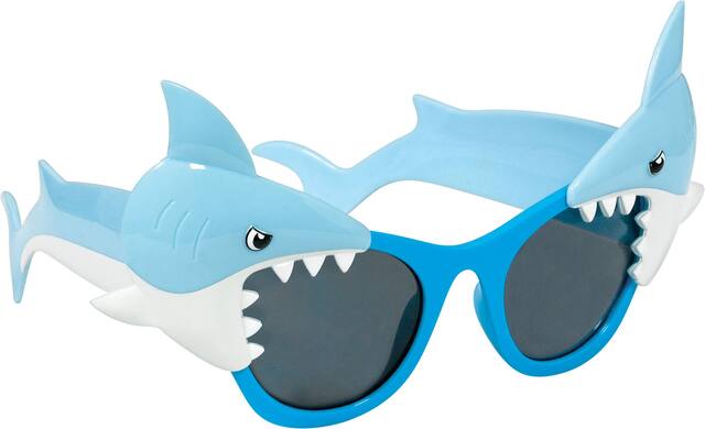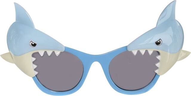• Crazy plastic sunglasses feature blue frames with two blue and white shark attachments around the lenses
