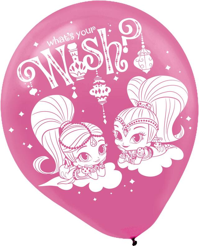 These latex balloons come in blue pink and purple and feature images of Shimmer and Shine with the headline What's Your Wish?