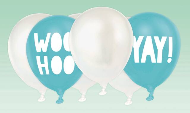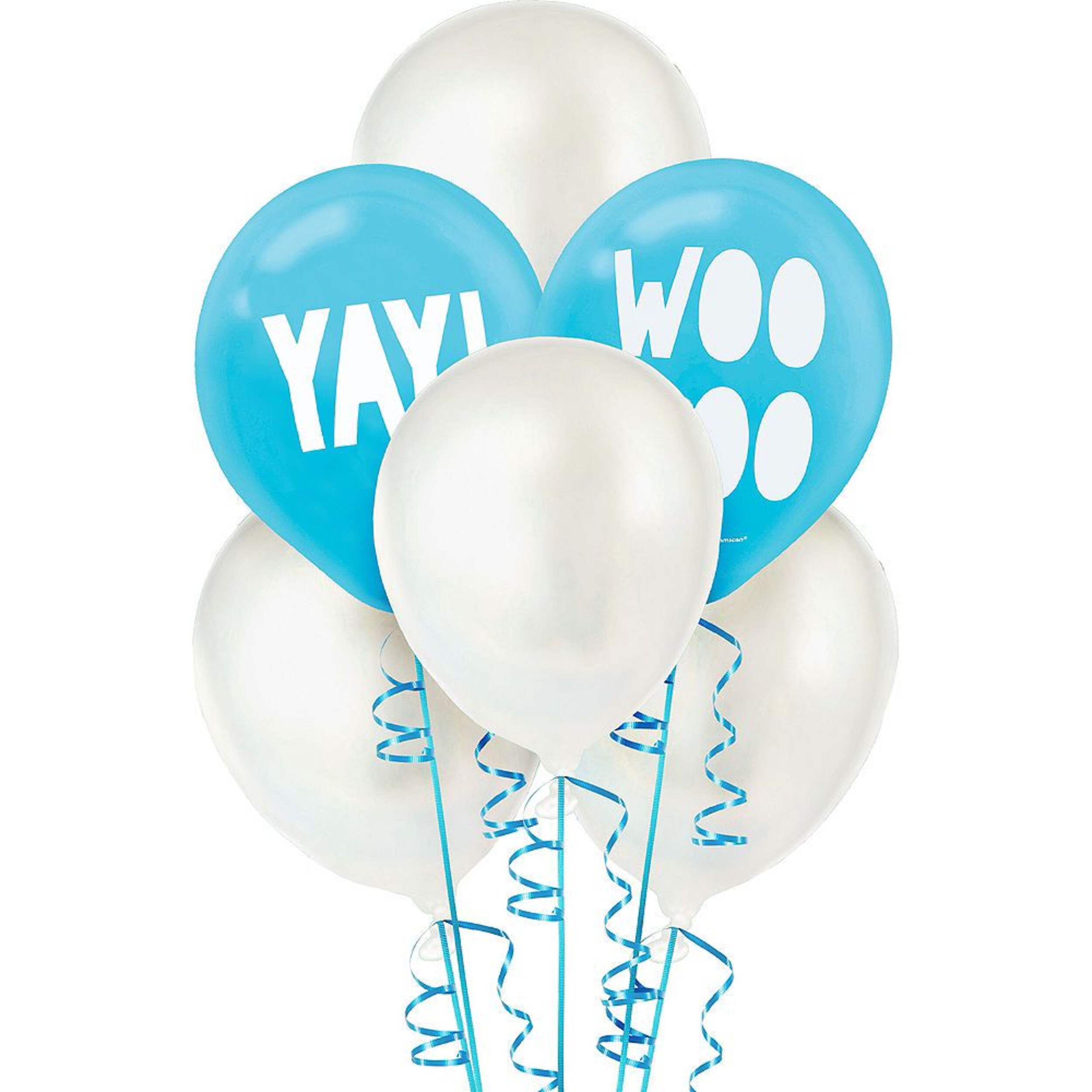 You may be interested in these similar products shown below.Shimmering Party Balloons feature two latex balloons that read "Woo Hoo" and "Yay" as well as four white balloons with a pearlescent finish