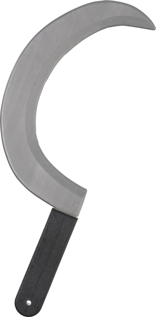 Resembles a real metal sickle, complete with a black handle and curved edge