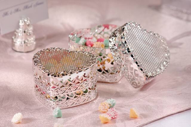• Silver Heart Wedding Favour Boxes features an elegant stenciled design
