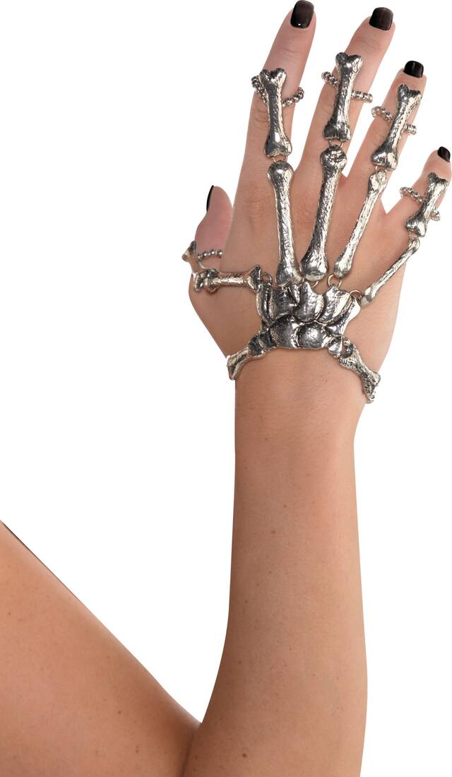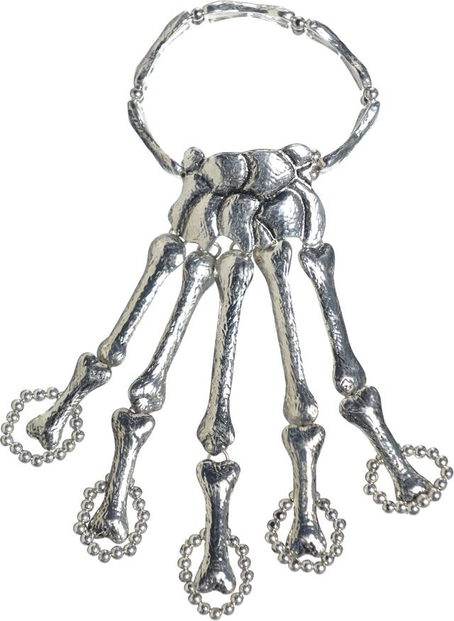 Impress the undead with the Skeleton Bones Finger Bracelet, Silver, Adult, One Size. This silver-coloured metal bracelet has the design of the popular slave bracelet and features skeleton bones that extend down your hand, attaching to your fingers with elastic bands. There is also an elasticized bracelet that fits around the wrist for easy movement while you scare your friends or while you are dancing the night away. Use this Halloween jewellery as part of your skeleton costume, or anytime you feel like picking a bone with someone. The metal bracelet measures 3 x 5 inches and is intended for adult use only.