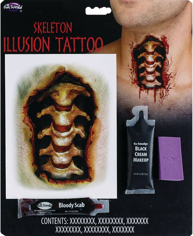 Also comes with bloody scab, cream makeup, and sponge Tattoo
