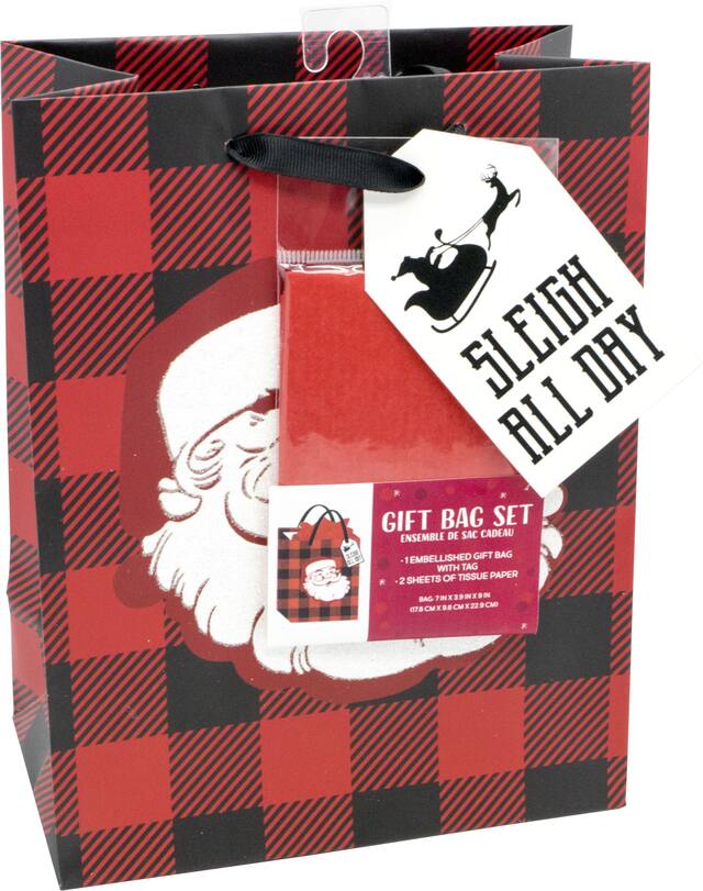 Features a black and red plaid gift bag with an image of Santa, a gift tag that says "Sleigh All Day," and two sheets of red tissue paper