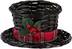 Small wicker Christmas basket is shaped like a top hat with a red plaid hatband and a sprig of holly