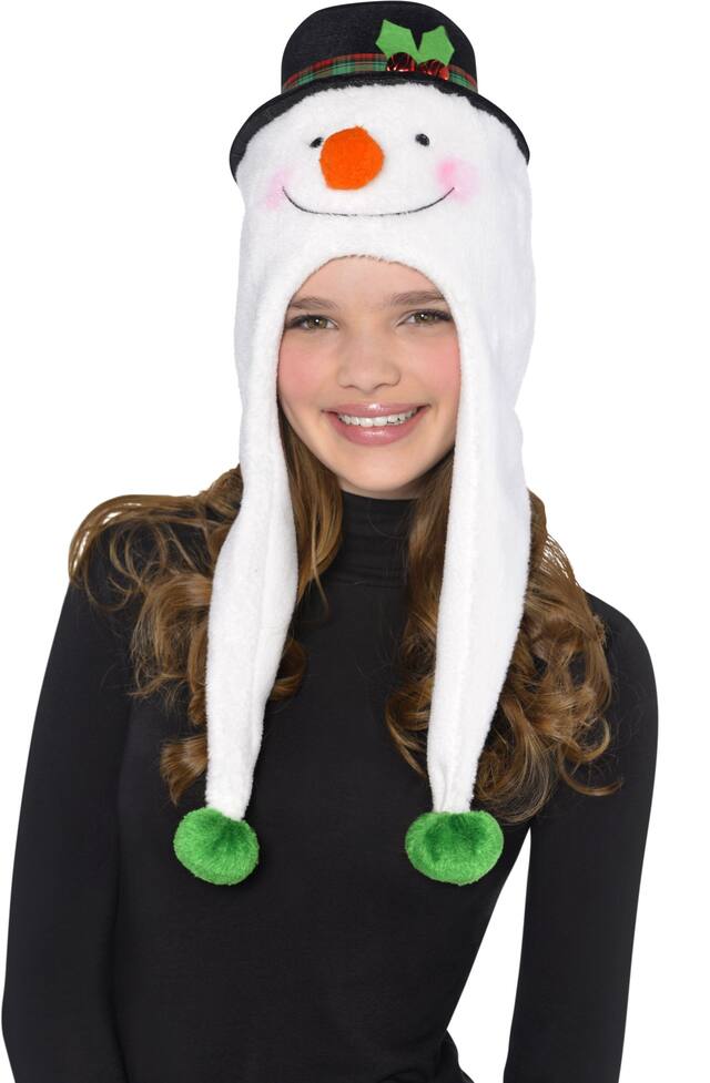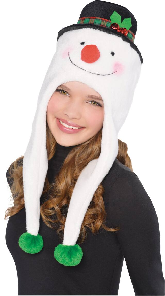 Made of super soft fleece and features a snowman's face wearing a black top hat decorated with holly and two red jingle bells