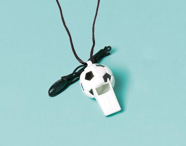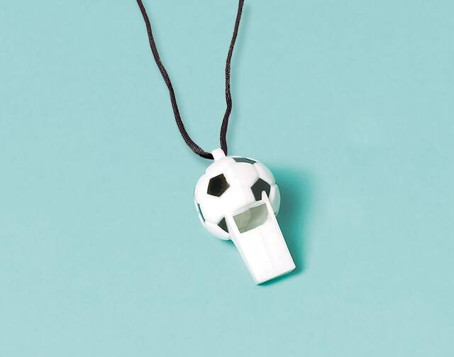 Plastic whistles look like mini soccer balls and come on a black lanyard to wear around the neck