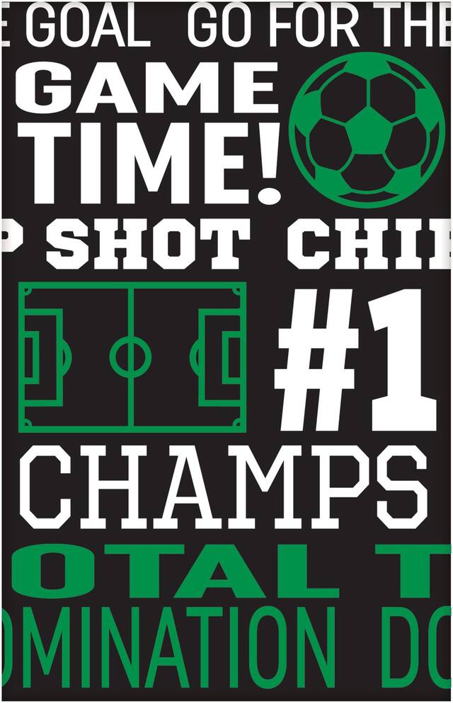 You may be interested in these similar products shown below.Make your dining table the MVP of your next soccer party with this Goal Getter Soccer Table Cover. The black side panels featuring words like "Chip", "Shot", and "Go For The Goal" set the scene for an awesome soccer bash, while the white center panel is perfect for displaying food, drinks and decorations.