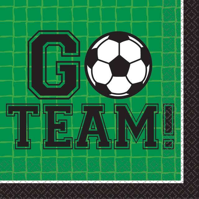 Soccer-themed beverage napkins feature a green splatter design with a soccer ball image and a "Goal Getter" headline